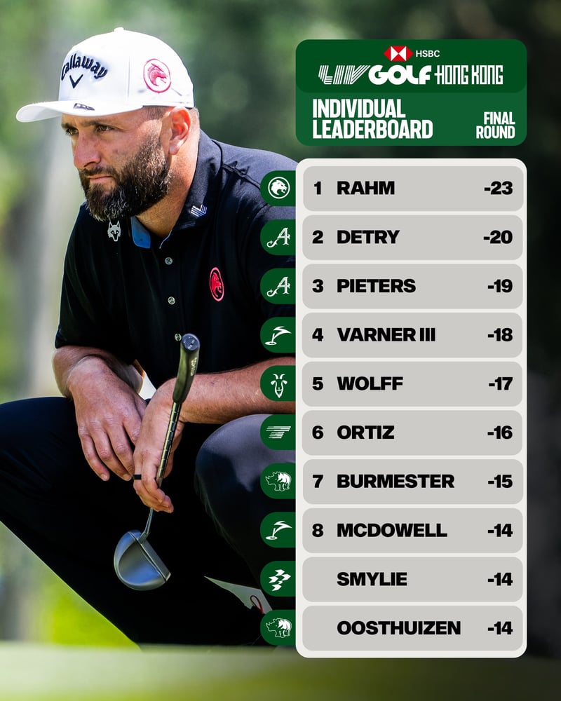 Para llegar a tal éxito Rahm completo su participación con -23, o lo que es lo mismo, con tres golpes de ventaja sobre el belga Thomas Detry y cuatro sobre su compatriota Thomas Pieters. Como no puede ser de otra manera, y ya con el triunfo en el bolsillo, el vasco subrayó que se sentía "muy aliviado", admitiendo nada más alzar los brazos sobre el 'green' del hoyo 18 la necesidad que tenía de sumar a su palmarés el título número 23 de toda su carrera, tercero en LIV después de Reino Unido y Chicago, y el cual le aúpa al top 40 del ránking mundial.