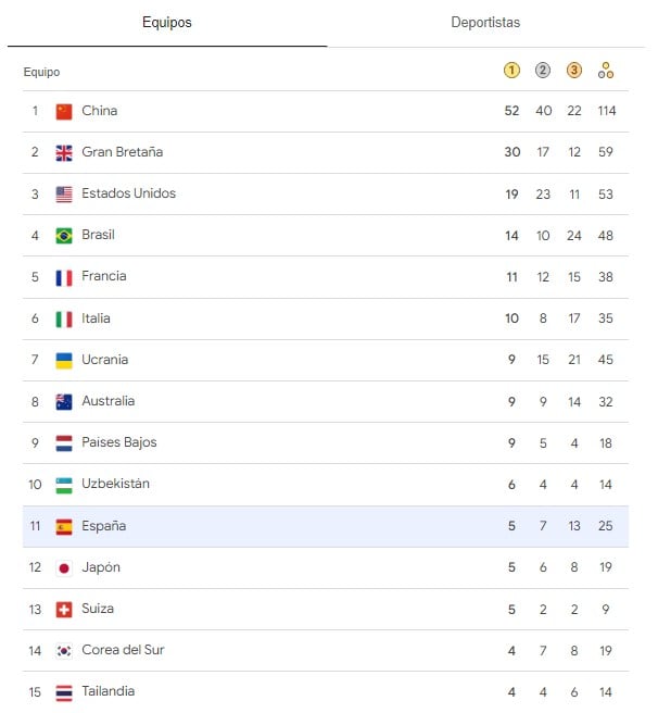 España aumentó con estos resultados su botín a 25 medallas en París (5 oros, 7 platas y 13 bronces) y se mantiene en la undécima posición de la clasificación de países, que, un día más, sigue liderada por China con 51 metales (51 oros, 39 platas y 22 bronces), por delante de Gran Bretaña con 59 (30, 17 y 12), Estados Unidos con 53 (19, 23 y 11), Brasil 48 (14, 10 y 24) y Francia 38 (11, 12 y 15).