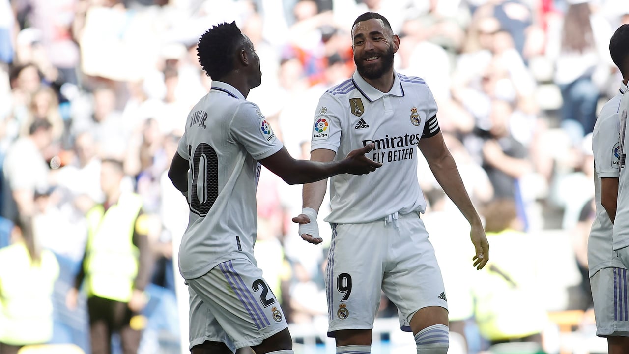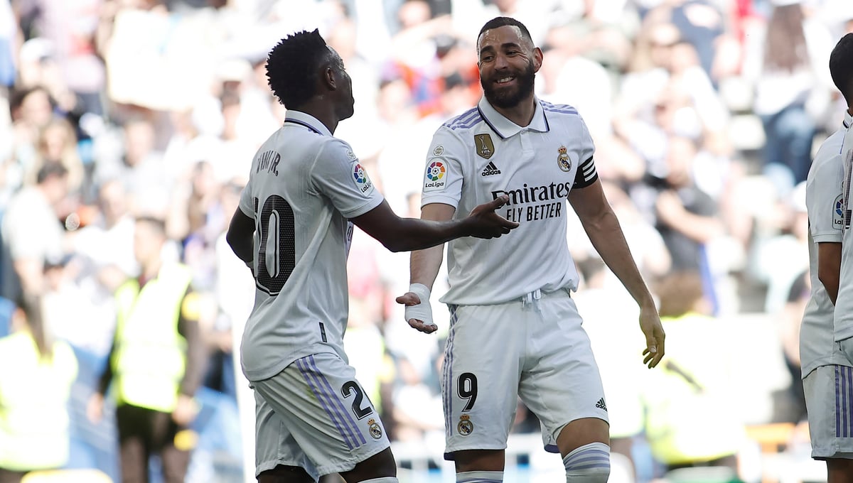 Benzema celebra uno de sus tres goles ante el ValladolidUES