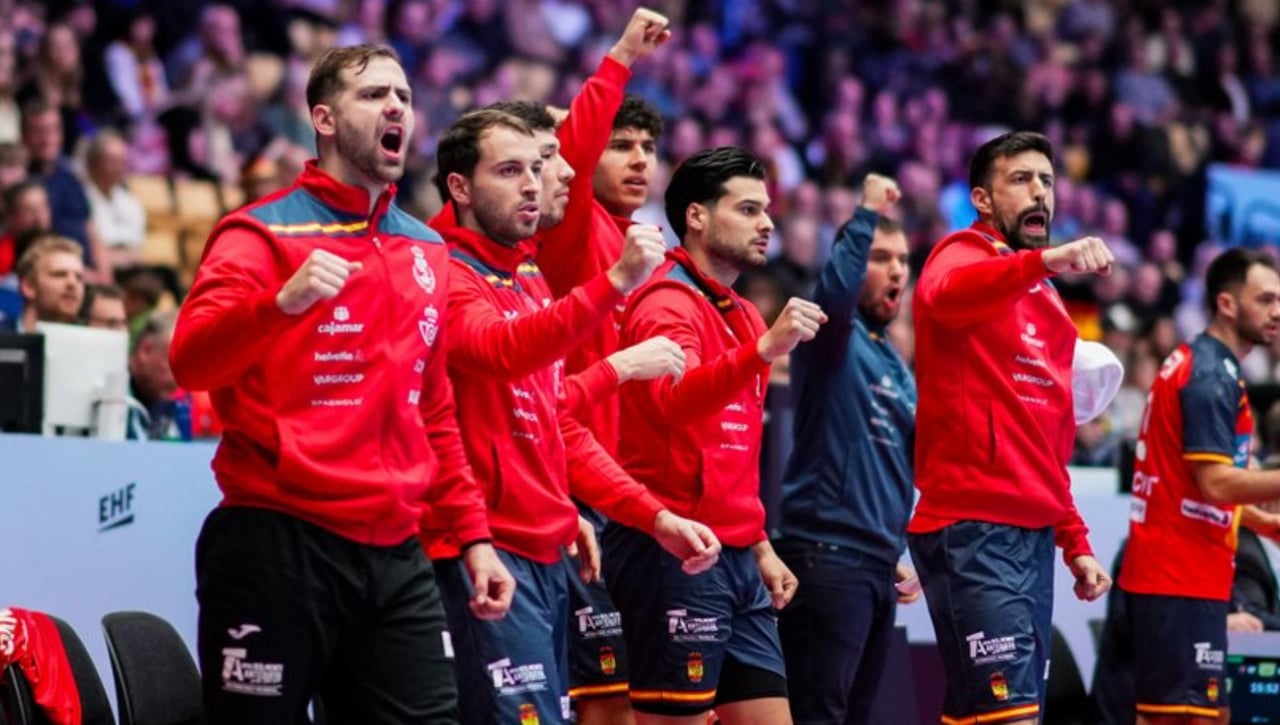 El banquillo español celebra por todo lo alto ante Serbia.@RFEBalonmano