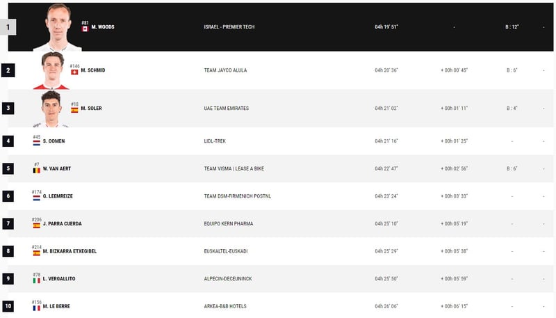 Woods entró en la meta en solitario con un tiempo de 4h.19.51, a una media de 40,5 km/hora. En el momento de la llegada del canadiense, el pelotón con los favoritos acumulaba un retraso de 12 minutos.
