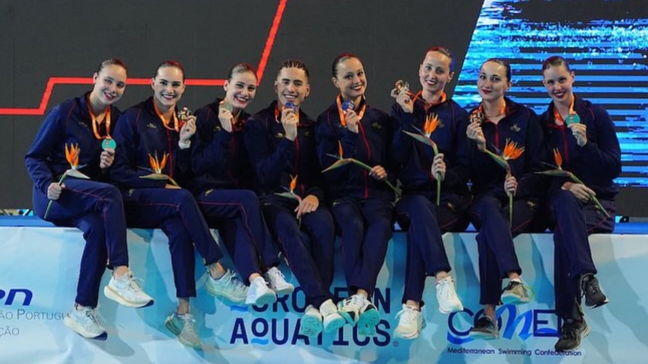 El equipo español posa con una de las medallas conseguidas en el Europeo de 2025.@RFEN_Oficial