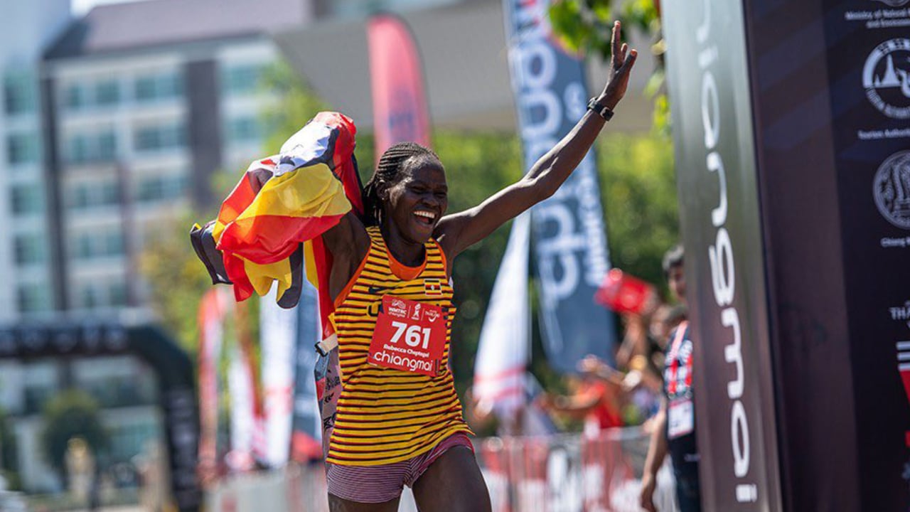 Rebecca Cheptegei, celebra su victoria en una carrera.X / @UgaAthletics2