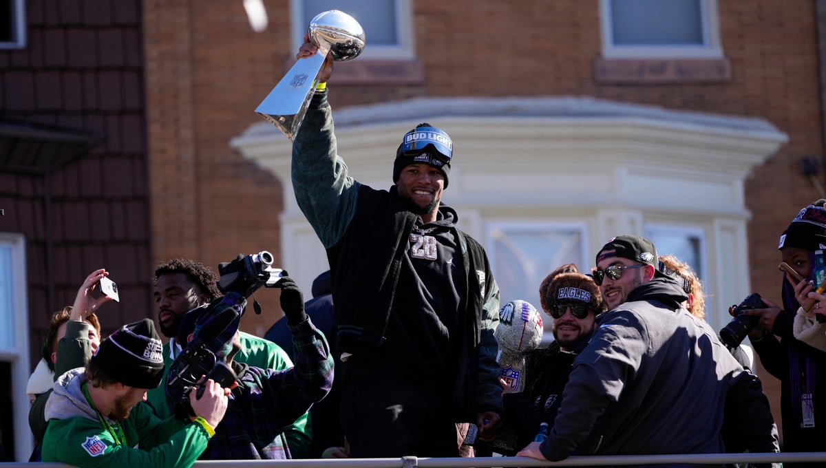 Saquon Barkley celebrando el título de la NFL de los Eagles durante un desfile en PhiladelphiaCordon Press