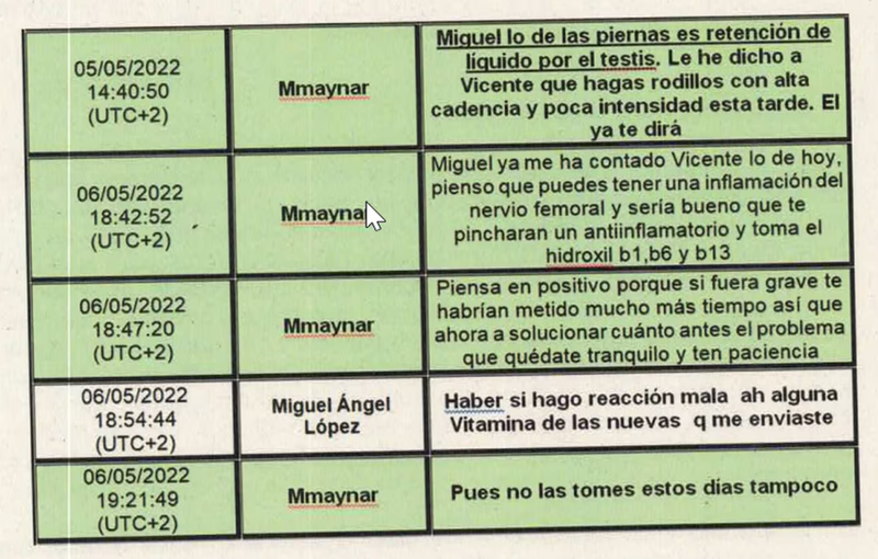 Esa es la red que habría suministrado sustancias prohibidas a Miguel Ángel López durante el Giro de Italia de 2022, cuando según AS –y siguiendo los informes de la Guardia Civil y la Fiscalía– el ciclista habría consumido Menotropina, un medicamento que suele utilizarse para los tratamientos de fertilidad. Esta conclusión, a la cual ha llegado la UCO, se acredita a través de escuchas y pruebas. Más claro, se han interceptado conversaciones entre Maynar y López en las que se nombra una sustancia como 'Testis', la cual según la Guardia Civil corresponde a la mencionada Menotropina. Además, se detalla que esta sustancia le llegará en el mencionado Giro de 2022 a través de su masajista 'Vicentín'. Todo se complicó después de la administración intravenosa, ya que provocó una importante inflamación al ciclista, obligando a su retirada. He aquí la imagen a la que ha tenido acceso el citado medio.