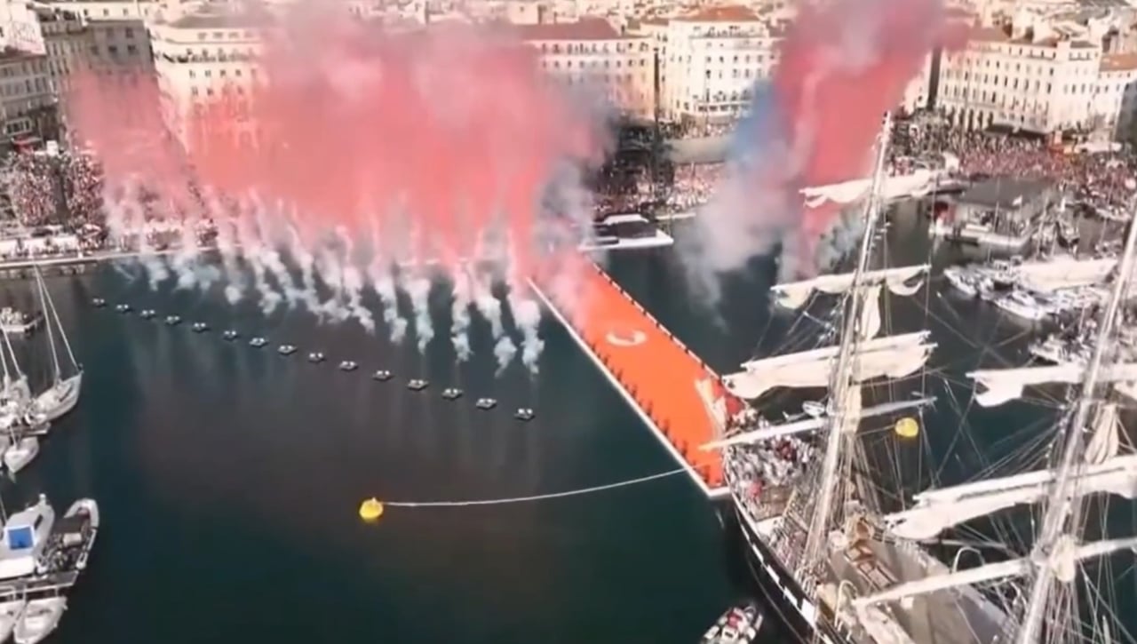 En dicha ceremonia se encendió el pebetero y a la misma asistieron 150.000 personas, que pudieron deleitarse con Belem, un histórico barco de tres mástiles que llevaba la llama y fue recibido por más de 1.000 barcos que le esperaban en el puerto de Marsella.