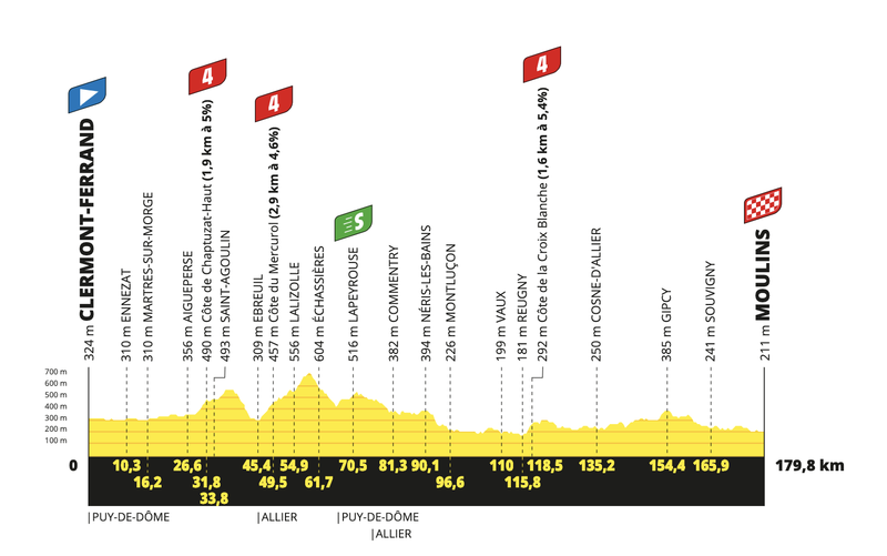 Con menos dureza que la anterior jornada, en la cual se vivió un auténtico perfil rompepiernas, en esta ocasión nos encontramos con un día propicio para que los velocistas den rienda suelta a la potencia de sus piernas. Es verdad que hay ciertas dificultades por el camino, exactamente tres cotas de cuarta categoría, pero la última de ellas está a 65 kilómetros de meta y raro sería que los equipos interesados no pudiesen controlar la situación en casi de que algunos valientes buscasen la fuga. Especial expectación ha creado la recta final en Moulins, 1.300 metros que se antojan un escenario perfecto para vivir una espectacular volata.