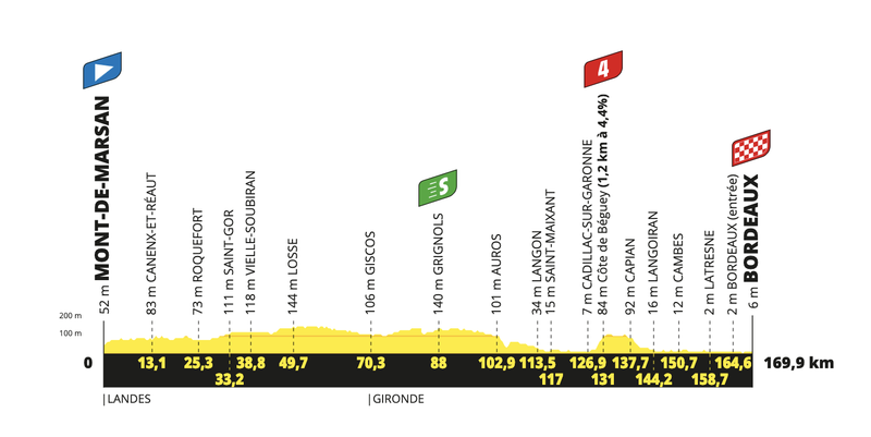 La séptima etapa de la Grande Bouclé, la cual llega justo el 7 de julio, contará con 169,9 kilómetros entre Mont-de-Marsan y Burdeos en un recorrido en el que la única dificultad será una cota de cuarta categoría a 40 kilómetros del final. Aunque es sin duda un perfil pensado para velocistas, no se descarta que una fuga lo intente, e incluso que en el propio pelotón haya movimiento en la mencionada subida para quizás eliminar a alguno de los favoritos de cara a la volata.