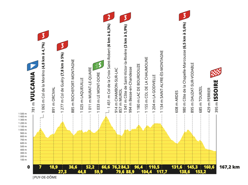 Establecidos ya en el Macizo Central, raro será que los cazaetapas no se pongan las pilas desde el primer momento para buscar una fuga que les conduzca a la gloria, y es que tras la salida se comenzará a ascender casi de manera inmediata. Otro de los atractivos en este 11 de julio será ver un final en descenso. Así es. Tras coronar la última ascensión los corredores irán siempre hacia abajo hasta encontrar la meta.