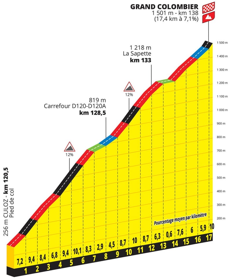 Como no podía ser de otra manera, el Tour de Francia nos ha preparado un impresionante final para el 14 de julio. En un recorrido de casi 140 kilómetros, la calma de la llanura dará lugar a una auténtica tempestad en el final de la etapa. Tras calentar piernas en la subida a la meseta Hauteville-Lompnes, llegará la hora de que los favoritos se enfrenten al Grand Colombier, 17,4 kilómetros de ascensión con una pendiente media del 7,1%.