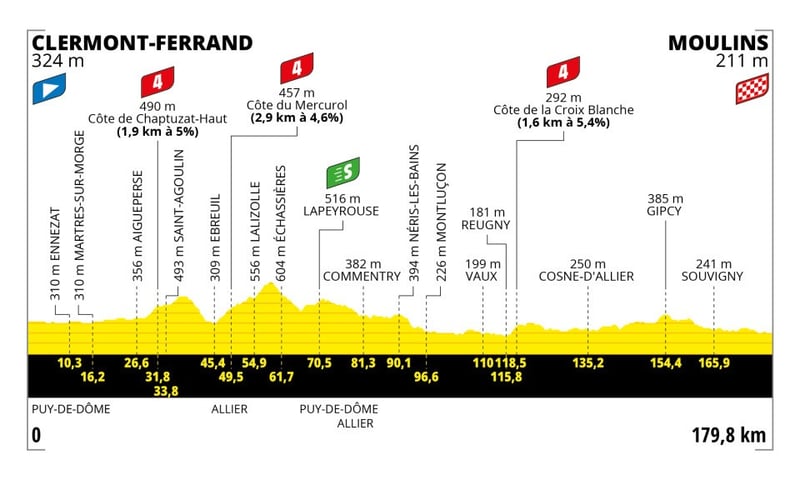 Con menos dureza que la jornada anterior, parece el día propicio para que los sprinters vuelvan a tomar protagonismo. Hay ciertas dificultades por el camino, pero no con la suficiente envergadura como para evitar que un par de equipos con energía puedan controlar la situación. La recta final en Moulins, de 1.300 metros, se antoja como un escenario perfecto para que los velocistas den rienda suelta a toda su potencia.