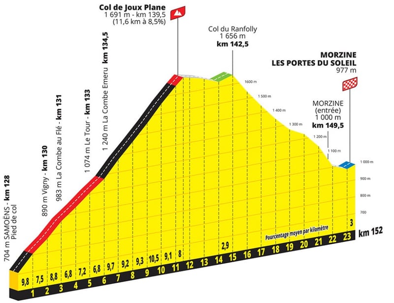 Cuando decíamos al principio que se trata de un recorrido hecho para escaladores, no engañábamos a nadie. Tras la celebración del 14 de julio llega una etapa con tres puertos de primera categoría y un especial, el Col de Joux Plane, donde debería decidirse un recorrido que cuenta con hasta 4.200 metros de desnivel. Además, es sin duda un día para ciclistas habilidosos, ya que la carrera concluye con ocho kilómetros de bajada.