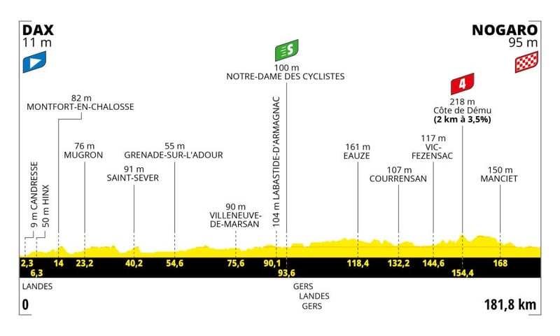 Si la anterior etapa apunta a una llegada masiva, esta no lo es menos. 182 kilómetros casi plenamente llanos que invitan a los favoritos a la carrera –y a sus equipos– a guardar fuerzas mientras otros se ocupan de llevar el pelotón. Curioso será sin duda ver el final del recorrido en el circuito automovilístico de Nogaro, donde espera a los corredores una recta final de 800 metros.