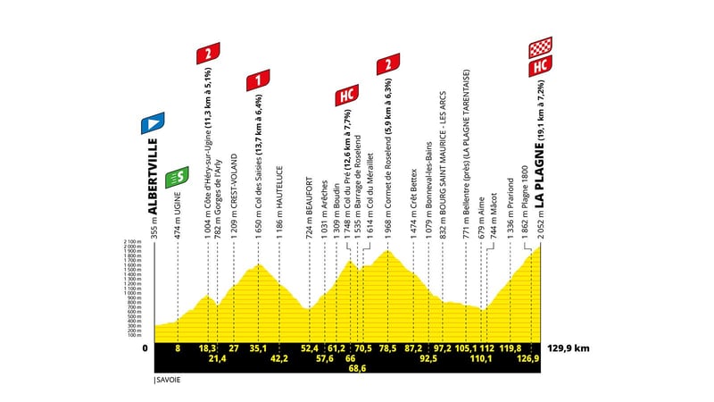 Esta jornada iba a tener 129,9 kilómetros, con salida en Albertville y cinco dificultades montañosas, sin embargo, se ha tenido que recortar hasta los 95 kilómetros, debido al "descubrimiento de un brote de dermatitis nodular contagiosa que afecta al ganado de un rebaño situado en el Col des Saisies y que ha obligado al sacrificio de los animales". Pero pese a ser corta, será intensa. La jornada comenzará con el ascenso a la cota de Héy-sur-Ugine, de segunda categoría. Seguido del a subida al Col du Pré, de categoría especial, 12,6 kilómetros al 7,7 %, que casi se junta con el hermoso Comet de Roselend, de segunda categoría, cuya cima está a 51 kilómetros de meta, de los que los 19 últimos son la subida final a La Plagne, con una pendiente media del 7,2 %.