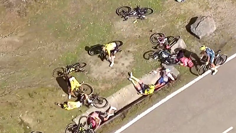 Diferente es para Jonas Vingegaard, que ha sido el que peor ha salido. Sobre el asfalto era por el que más se temía, fue evacuado de urgencia y el primer parte médico confirmó que se ha fracturado la clavícula y tiene varias costillas rotas; luego se ha sabido que, además, sufre una contusión pulmonar y un neumotórax. El ciclista danés del Team Visma | Lease a Bike se perderá una parte importante de la temporada y, aunque se recupere a tiempo para el Tour de Francia, habrá que ver en qué condiciones llegaría y si podría hacer una preparación acorde a la carrera. "Jonas está consciente y será examinado ahora en el hospital. Seguiremos actualizando más adelante", señalaban desde su equipo.