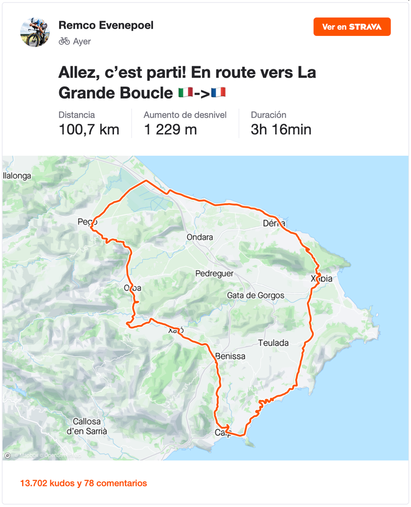 El belga, actual campeón del mundo contrarreloj, afrontará en 2024 su primer Tour y está decidido a plantar batallas a los mejores. Sin ir más lejos, ayer lunes estuvo entrenando y publicó en su cuenta de Strava su primera actividad de pretemporada con una salida en bicicleta con inicio y llegada en Calpe. A tal preparación añadió el siguiente texto: "¡Vamos, esto empieza! En camino hacia la Grande Boucle", acompañado dos emojis con las banderas de Italia y Francia.
