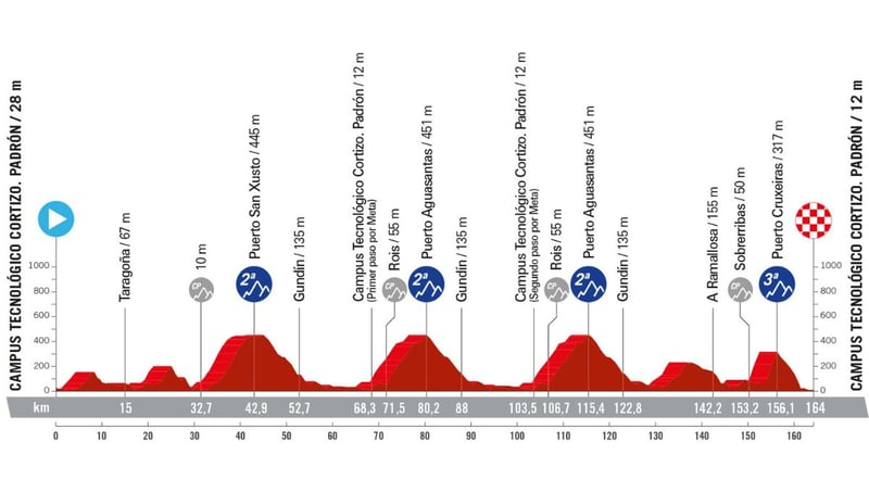 La etapa comienza y acaba en el mismo lugar, el Campus Tecnológico Cortizo de Padrón, pero entre medias hay mucho terreno rompepiernas que podría pasar factura a más de uno. No obstante, el último puerto, a apenas unos kilómetros de meta, no es exigente como para que se marquen diferencias.