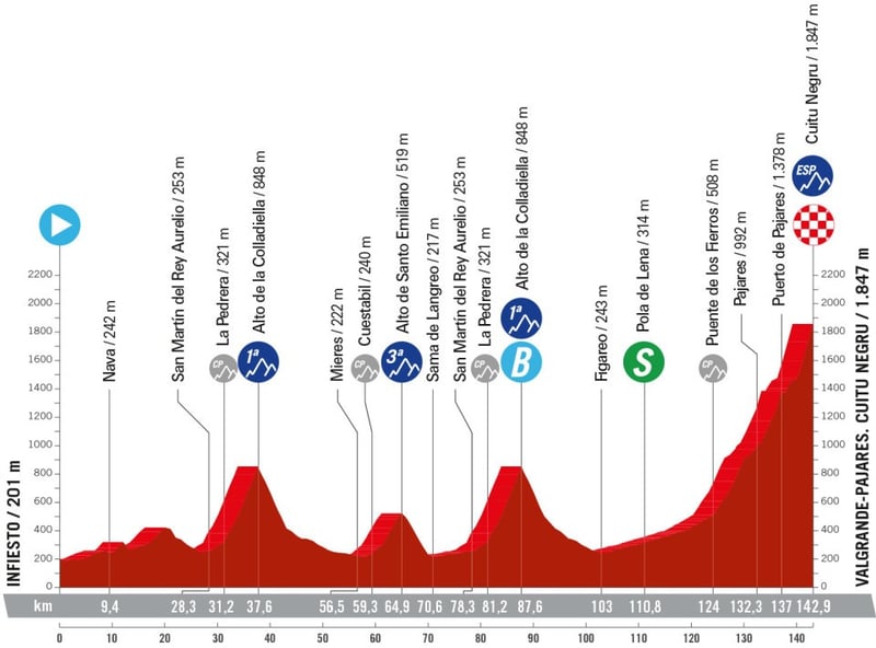 La segunda semana termina con una típica y muy dura etapa de montaña asturiana. La doble ascensión a Colladiella dará empaque y dureza a los pocos kilómetros de una etapa que tendrá su fiesta final en el Cuitu Negru, un auténtico coloso asturiano que tiene su parte más dura tras superar la estación de Pajares, con rampas de hasta el 23%. Es un día muy importante para los favoritos a la general, quizá junto al martes y a la crono del domingo en Madrid, los más determinantes que quedan pendientes.