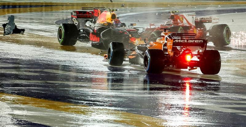 El piloto español Fernando Alonso (McLaren-Honda) abandonó el Gran Premio de Singapur en la novena vuelta por pérdida de potencia del motor de su monoplaza, después de recibir un golpe en la salida del holandés Max Verstappen (Red Bull).
