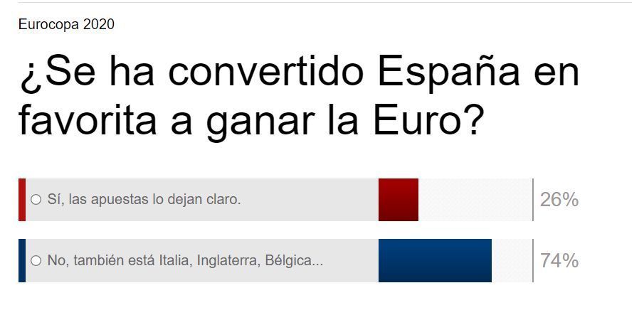 Después de este cambio, tanto en actitud como juego y resultados, España ha pasado a ser favorita en muchas casas de apuestas. Por ello, ESTADIO Deportivo quiso sondear a su audiencia a trasvés de su #EncuestaHelvetia para comprobar cuanta confianza hay en España para conseguir el título continental. Lo cierto es que los votantes de este periódico no confían mucho en el combinado nacional pues sólo un 26% la ve campeona mientras que el 74% cree que no le da para lograr el entorchado.