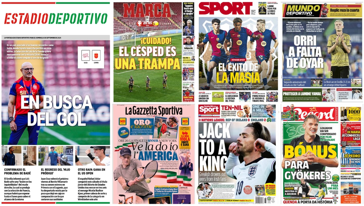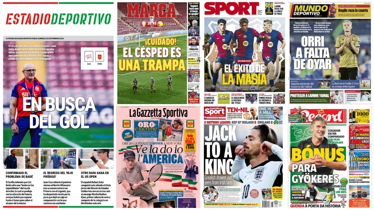 El repaso de prensa con las portadas de los principales periódicos deportivos en este domingo, día 8 de septiembre de 2024, deja mucho fútbol de selecciones. Este domingo, España visita a Suiza en la segunda jornada de la UEFA Nations League buscando el gol. Muchos fueron los que se vieron este pasado sábado en las contundentes victorias de Alemania sobre Austria (5-0), de Países Bajos ante Bosnia (5-2) o de Georgia ante República Checa (4-1), además de las de Inglaterra en Irlanda (0-2) o Grecia ante Finlandia (3-0). En cuanto a los nombres propios del día, destaca Lamine Yamal, que preocupa mucho en un FC Barcelona ante las 'cacerías' que suele sufrir por parte de sus rivales.