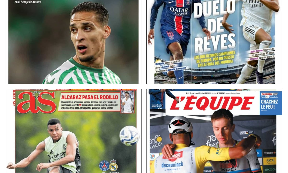 Día importante este miércoles 9 de julio para la actualidad deportiva, con muchos frentes abiertos en todos los equipos de LaLiga, inmiscuidos en pleno mercado de fichajes, donde destaca por encima de todo un movimiento, el de Antony y el Betis. Mientras el interés del grueso del mundo del fútbol está realmente en Nueva York, donde dos de los mejores equipos del mundo, el PSG y el Real Madrid, se miden esta noche con la final del mundial de clubes como premio y objetivo. Mientras que en el mundo polideportivo el momento es excelso, con Wimbledon entrando de lleno en su parte final y un Carlos Alcaraz de dulce, además del Tour de Francia, donde Tadej Pogacar se ha hecho centenario.