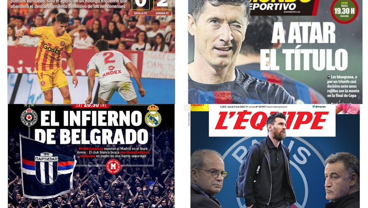 Las portadas de la prensa deportiva de este martes 2 de mayo de 2023 llevan con el final de la jornada 31 y el comienzo hoy ya de la 32. No hay tiempo para el descanso. Ayer el Athletic lograba un milagroso empate en el tiempo añadido de penalti y el Sevilla de Mendilibar rompía su buena racha de cuatro victorias y un empate y caía derrotado por primera vez desde la llegada del vasco al banquillo sevillista. Y llegó ante un rival, el Girona, que aprovechó dos errores del conjunto local para hacer dos goles y luego pertrecharse bien en defensa. Por eso titulamos en ESTADIO Deportivo con "la de arena".