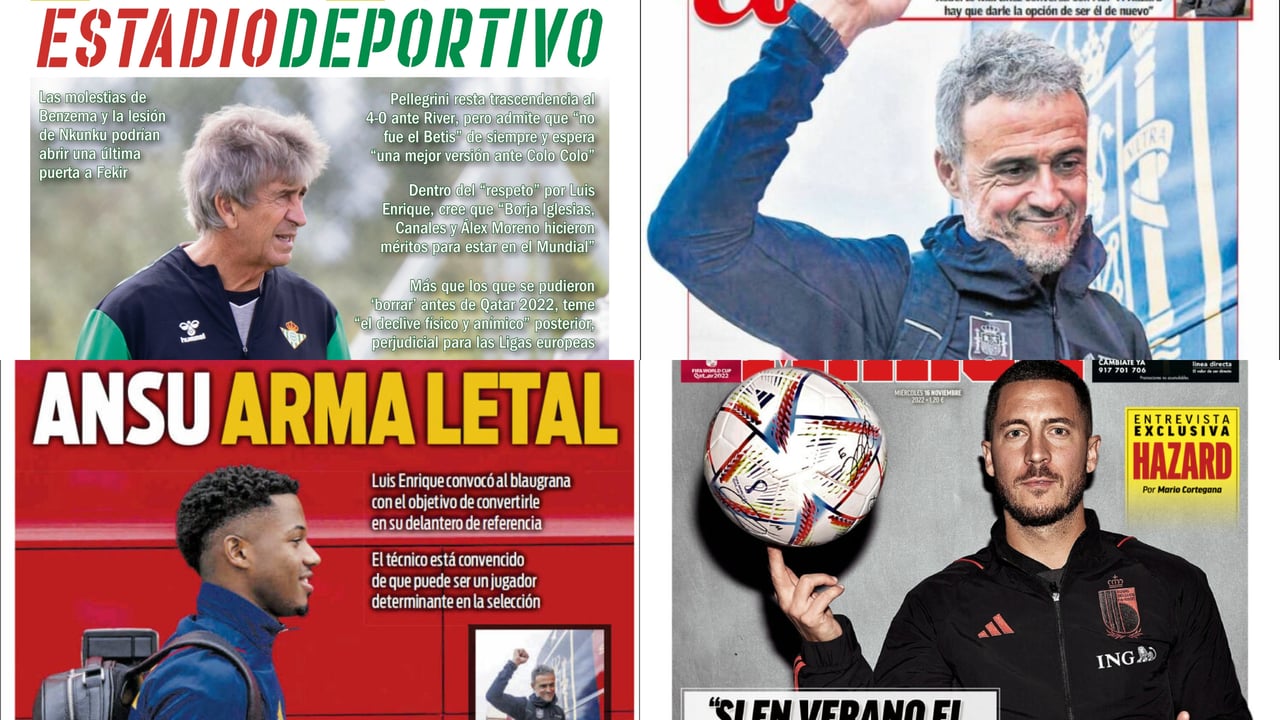 Las portadas de la prensa deportiva de este miércoles 16 de noviembre llega con toda la última hora del Mundial de Qatar que está a tan sólo cuatro días para que dé comienzo y al que, en un giro inesperado de los acontecimientos, podría acudir un jugador más del Real Betis. Efectivamente, hablamos de Nabil Fekir, que no ha sido incluido en la lista definitiva de Deschamps por Francia pero que ante las molestias de Benzema y la lesión de Nkunku, podrían hacer que llamara a última hora al atacante del Real Betis, que ya se proclamó campeón del mundo con los 'Bleus' en 2018.