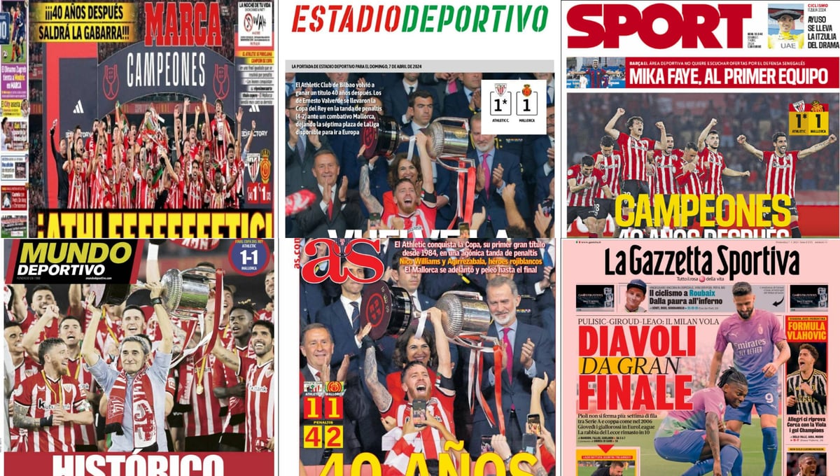 Las portadas de este domingo 7 de abril de 2024 en los principales diarios deportivos en España abren todos con el mismo tema como no podía ser de otra manera. Después de 40 años intentando coronarse, ayer el Athletic Club volvió a proclamarse campeón de la Copa del Rey en Sevilla. Y todos abren con la imagen de Iker Muniain levantando el trofeo y con algunas reacciones tras la final.