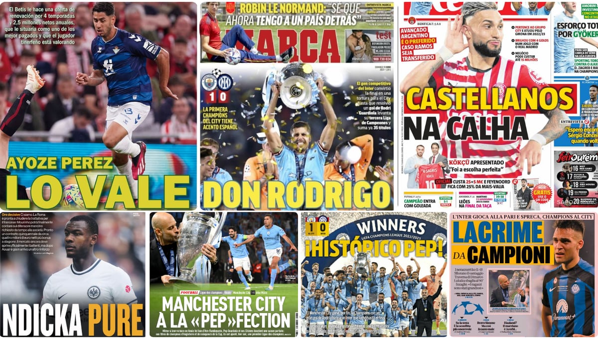 Rodri Hernández se convirtió en 'Don Rodrigo' en Estambul (Turquía) y soltó un zapatazo directo a la red que dio al Manchester City la primera Champions League de toda su historia tras vencer en la final al FC Inter de Milán por 1-0. El mediocentro español y su entrenador, un Pep Guardiola que se coronó como el primer técnico que consigue ganar dos tripletes con clubes distintos, acaparan casi todo el protagonismo en el repaso a las portadas de los principales periódicos deportivos en este domingo, día 11 de junio de 2023, en el que también resaltan nombres propios como los de Ayoze Pérez en el Real Betis, los de Marcos Acuña y el Taty Castellanos en el Sevilla FC o Evan Ndicka en la AS Roma, que se ha hecho con un central codiciado por los dos clubes hispalenses y por medio continente.