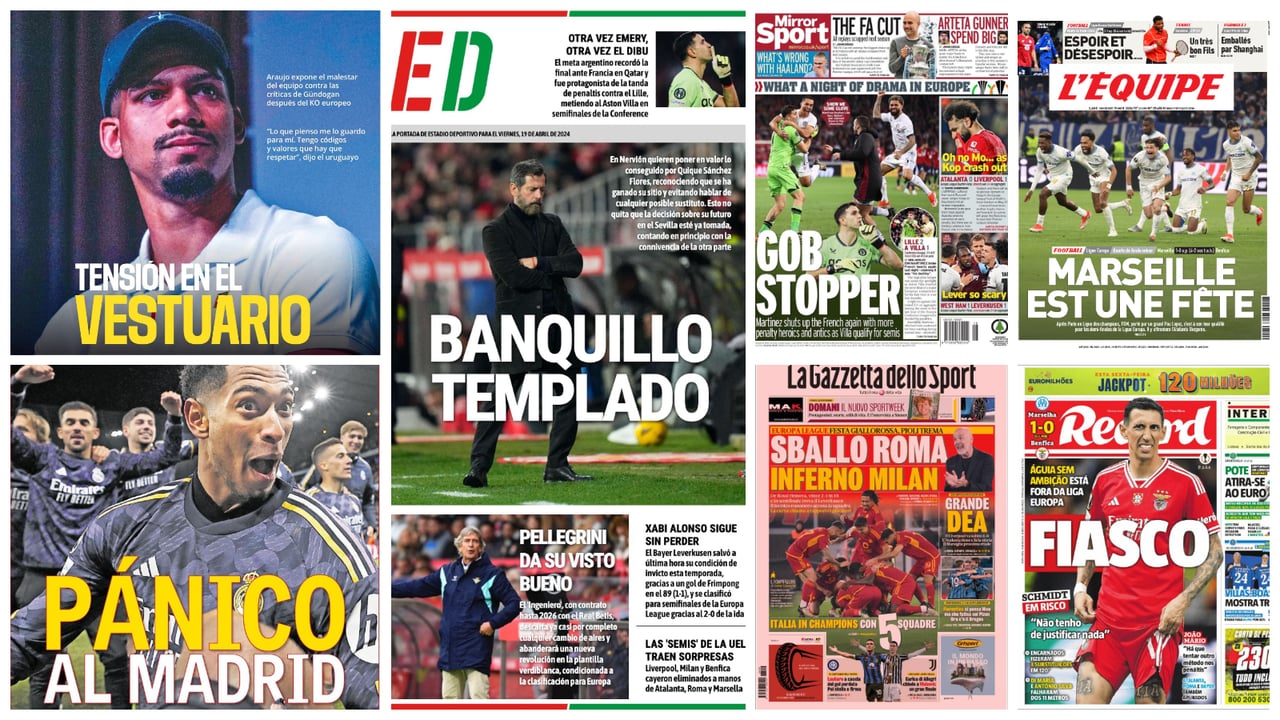 El resumen de prensa con las portadas de los principales periódicos deportivos para este viernes, día 19 de abril de 2024, llega marcado por los igualadísimos partidos de vuelta de los cuartos de final de la UEFA Europa League y la UEFA Europa Conference League, donde porteros como Pau López (Olympique Marsella), el 'Dibu' Martínez (Aston Villa) o Konstantinos Tzolakis (Olympiacos) se vistieron de héroes en las agónicas tandas de penaltis para decidir los semifinalistas. Sobresalen también los nombres de Xavi Alonso, que después de ganar la Bundelisga y meterse en la final de la Copa de Alemania ha metido al Bayer Leverkusen entre los cuatro mejores de la segunda competición continental, y el de José Luis Mendilibar, que podrá vengar viejas rencillas con Monchi en el vibrante duelo contra su paisano Unai Emery por vivir una nueva final continental. También sonrieron la AS Roma, que eliminó al AC Milan, la Fiorentina o el Atalanta, verdugo del Liverpool, además del Brujas de Ferrán Jutglà; mientras que la tristeza invadió a equipos como el 'Red' o el 'rossonero', el Benfica, el West Ham, el Fenerbahçe, el Lille, el Viktoria Plzen y el PAOK .