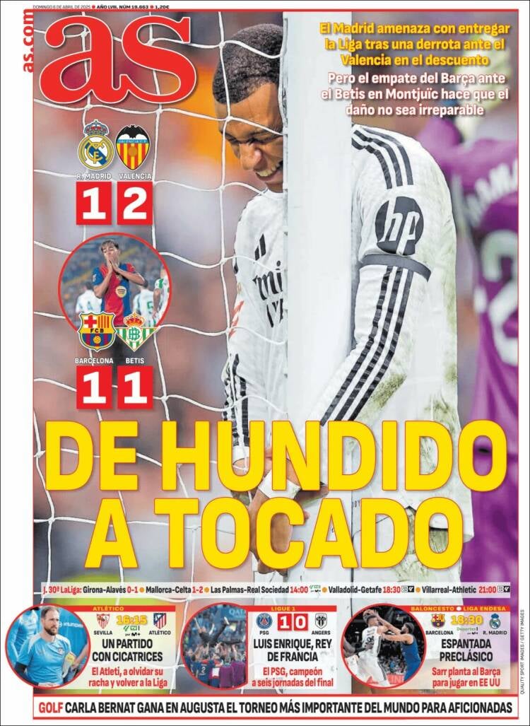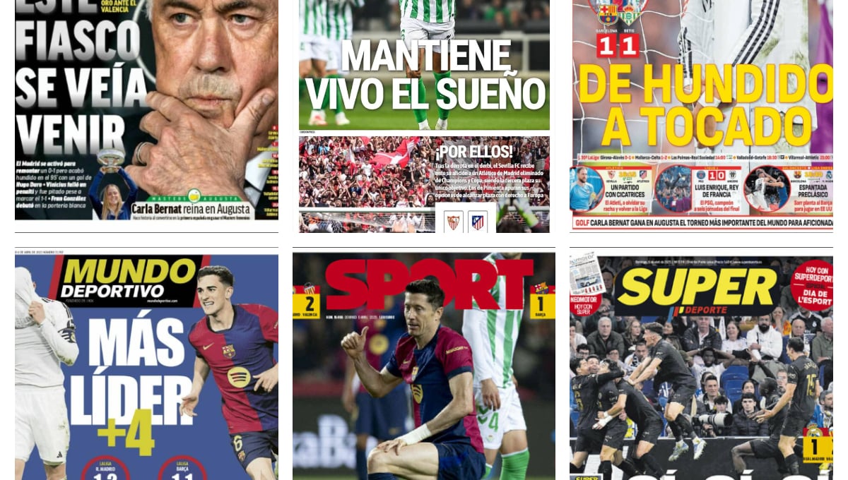 Las portadas deportivas de este domingo 6 de abril de 2025 vienen marcadas por la jornada 30 de LaLiga EA Sports. La competición liguera nos dejó resultados sorprendentes este sábado, que copan todas las cabeceras de los principales diarios de nuestro país. El FC Barcelona sigue ampliando su distancia en la carrera por el título liguero tras el 'batacazo' del Real Madrid frente al Valencia en el Santiago Bernabéu. Además, otro de los temas destacados del día es el choque entre el Sevilla FC y el Atlético de Madrid de este domingo.