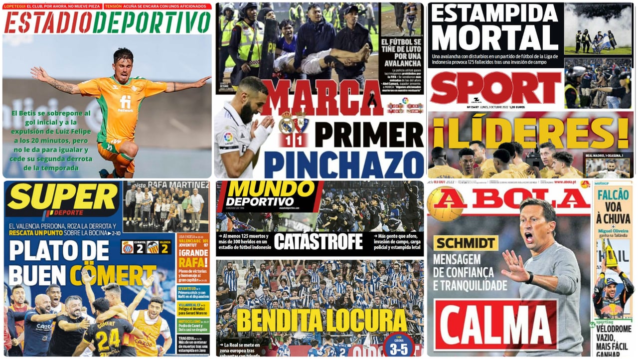 El domingo deparó muchísimas noticias destacadas en el mundo del deporte, pero en el repaso a las portadas de los principales periódicos deportivos en este lunes 3 de octubre destaca por encima de todo la tragedia vivida en Indonesia en la madrugada del sábado al domingo. El gobierno del país del sudeste asiático ha creado este lunes un grupo independiente destinado a investigar la estampida en el estadio de fútbol de Malaing que ha dejado 125 muertos en uno de los peores desastres deportivos del mundo.