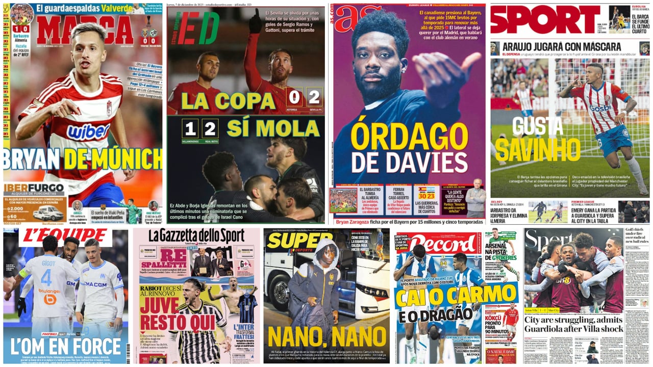 El repaso de prensa a las portadas de los principales periódicos deportivos en este jueves, día 7 de diciembre de 2023, llega con protagonismo compartido entre los partidos de la segunda ronda de la Copa del Rey y el mercado de fichajes con nombres como los de Bryan Zaragoza, Savinho, Alphonso Davies, Joao Félix o Gyokeres, entre otros. El batacazo copero de la UD Almería ante el modesto Barbastro deja al equipo indálico, colista de LaLiga, gravemente herido. Mejor sensación obtuvieron un Real Betis que supo reaccionar a última hora para evitar el K.O. ante el CF Villanovense y un Sevilla FC que ganó al Atlético Astorga con comodidad pero sin alardes para gritar un 'La Copa sí Mola'.