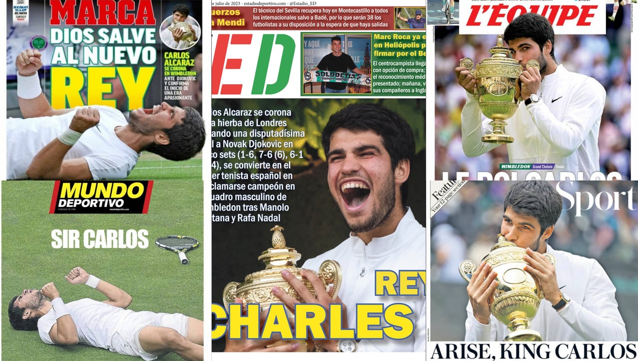 Las portadas de la prensa deportiva tanto nacional como internacional llega hoy con un clarísimo protagonista, y ese no es otro que el tenista española Carlos Alcaraz, que ayer consiguió ganar su primer Wimbledon ante Novak Djokovic, el siete veces campeón (1-6, 7-6 (6), 6-1 y 6-4), y cumple el sueño de su niñez: ganar el Grand Slam más bonito de todos y ante uno de los mejores de la historia.