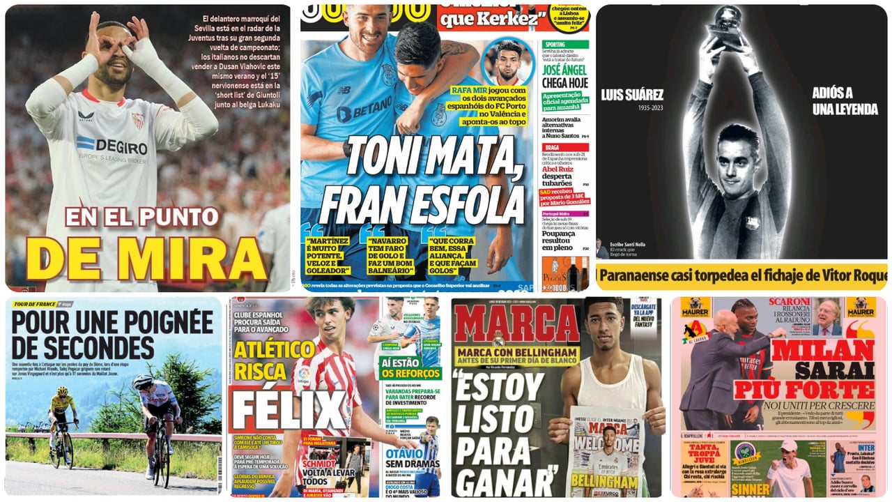 El repaso de prensa con las portadas de los principales periódicos deportivos en este lunes, 10 de julio de 2023, llega marcada por el fallecimiento de Luis Suárez Miramontes, único ganador del Balón de Oro en la historia del fútbol masculino español y cuya muerte se llora por igual en La Coruña, su ciudad natal, en Barcelona, en Milán o en Génova, donde dejó su sello como jugador del FC Barcelona, del FC Inter y de la UC Sampdoria. La triste noticia tiene eco en todos los medios de comunicación de España y de Italia, compartiendo protagonismo en los quioscos con el pulso entre Vingegaard y Pogacar en el Tour de Francia, con el dominio incontestable de Verstappen en la Fórmula 1 o con el mercado estival de fichajes, que deja hoy novedades sobre José Ángel Carmona, Youssef En-Nesyri o Rafa Mir, en el Sevilla FC; con Loren Morón y Héctor Bellerín, en el Real Betis; con Joao Félix, entre el Atlético y el Benfica SL; con Jude Bellingham iniciando su andadura en el Real Madrid; con Vitor Roque y el Barça...