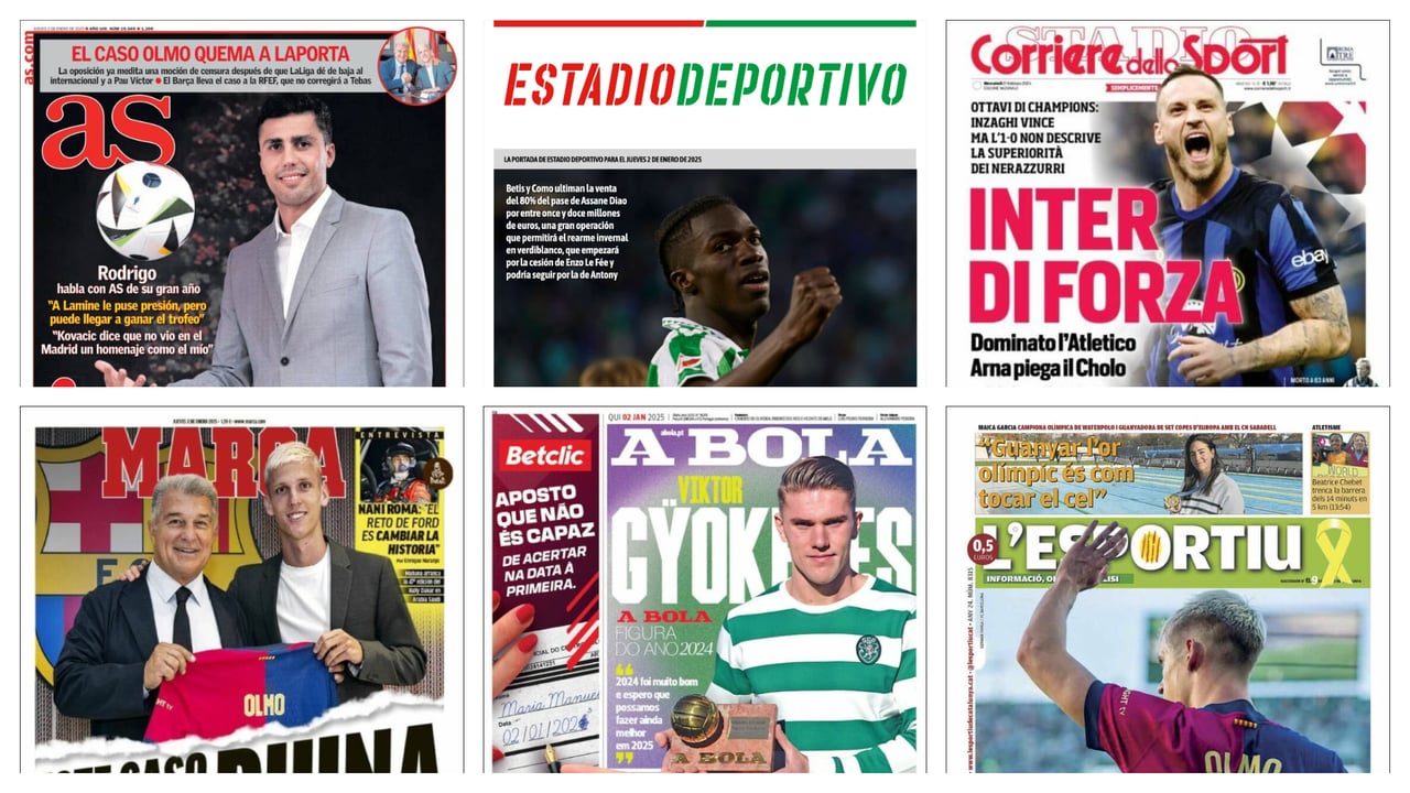 El Fútbol Club Barcelona y el 'caso Olmo' topa más de una portada de los tabloides nacionales de este 2 de enero, y no es para menos, ya que es una de las situaciones más delicadas con las que puede comenzar el año en la entidad catalana. Joan Laporta está en el punto de mira de socios, opositores y accionistas que creen que a día de hoy, las promesas que se hicieron el día de las elecciones a la presidencia están decayendo con la no inscripción del 'ex' jugador ya de la plantilla de Flick, al igual que lo ocurrido con Pau Víctor que está en las mismas circunstancias que su compañero, por lo menos por ahora.