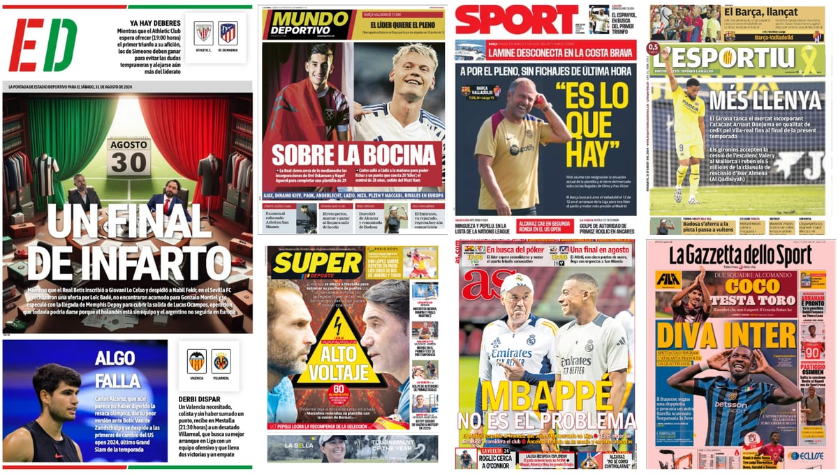 El repaso de prensa de prensa a las portadas de los principales periódicos deportivos en este sábado, 31 de agosto, aún transmite parte de la agitación que se respiró a lo largo de un infartante viernes en el que hubo de todo: el seleccionador español, Luis de la Fuente, dio su convocatoria para los partidos internacionales de septiembre; el Athletic Club y la Real Sociedad ya tienen ocho rivales cada uno en el nuevo formato de la Europa League y el Real Betis conoció a sus seis adversarios en el sorteo de la Conference League; en la previa de la jornada 4 de LaLiga EA Sports que arranca hoy. No obstante, la mayor agitación llegó con el 'deadline' del mercado veraniego de fichajes, con gran actividad en casi todos los clubes desde primera hora de la mañana y hasta el último segundo previo al cierre, a las 00:00 horas de este sábado.