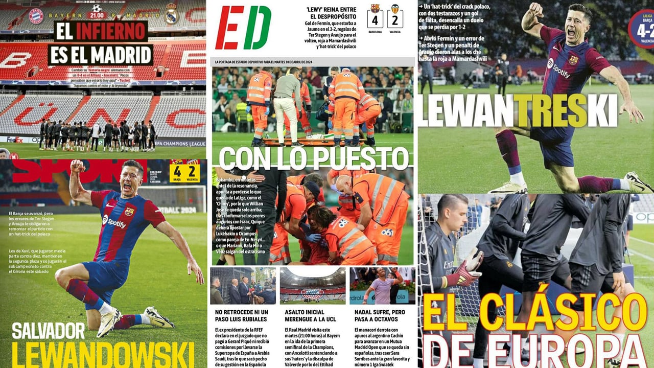 La prensa catalana, por su parte, se centra, lógicamente, en el triunfo del Barça ante el Valencia en un partido cargado de polémica por la expulsión del portero che y con Lewandowski como gran protagonista por sus tres tantos. De hecho, tanto Sport como Mundo Deportivo titulan sus portadas con el delantero polaco, empleando el segundo un curioso titular en el que adapta el nombre del punta a su producción goleadora: "Lewantreski". Sport, por su parte, apuesta por un titular más clásico: "Salvador Lewandowski".