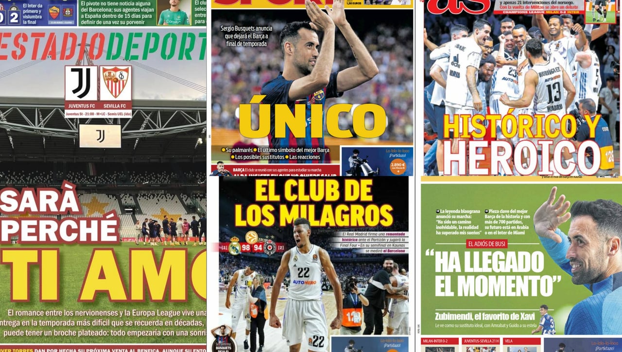 En Barcelona las portadas se centraron en torno a la figura de Sergio Busquets y tanto Sport como Mundo Deportivo llevan una foto del capitán a su primera página. El primero con la palabra 'Único' y el segundo, recogiendo una frase del protagonista de su vídeo de despedida: 'Ha llegado el momento'. "Hola culers: Ha llegado el momento de anunciar que esta sera mi última temporada en el Barça", dijo el '5' azulgrana en un vídeo compartido por el FC Barcelona. El club había ofrecido a Busquets seguir una temporada más por expreso deseo del entrenador, Xavi Hernández, pero el mediocentro de Badía del Vallès, que finaliza contrato el próximo 30 de junio, ha decidido no aceptar la renovación.