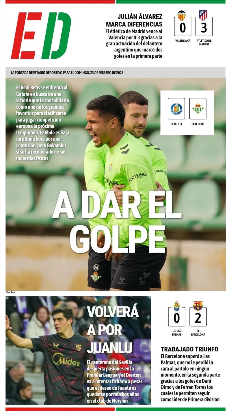 La jornada 25 de LaLiga EA Sports abre la mayoría de las cabeceras de nuestro país este domingo 23 de febrero. El Atlético de Madrid venció de forma contundente en Mestalla, metiendo presión en la carrera por el título liguero. Además, el FC Barcelona tampoco falló en su visita al Estadio Gran Canaria. El Real Betis está ultimando su preparación para el duelo frente al Getafe en el Coliseum. Por su parte, en la prensa internacional destaca el triunfo del Inter de Milán gracias a una actuación estelar de Lautaro Martínez que les impulsan hasta la primera posición de la tabla clasificatoria.