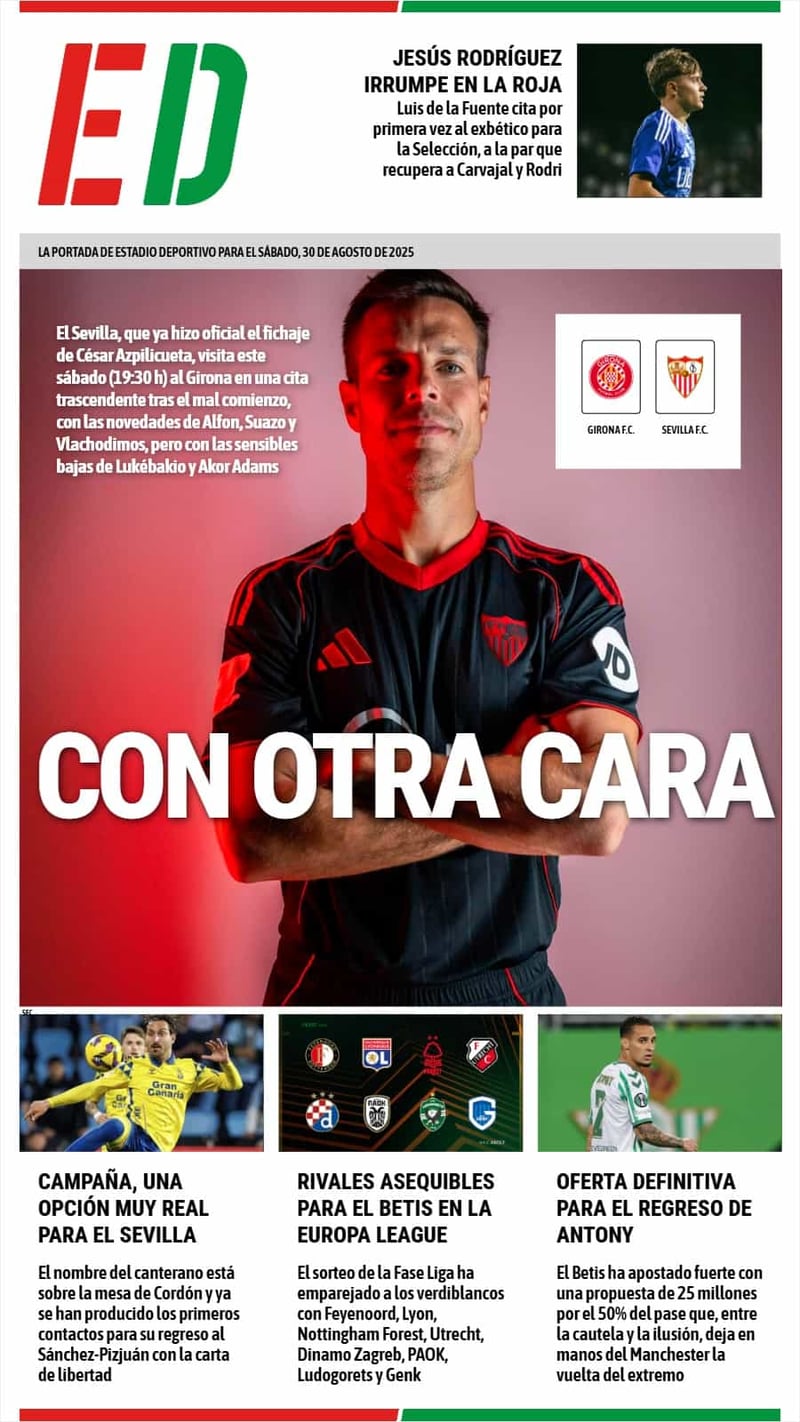 En Estadio Deportivo abrimos con el partido del Sevilla al Girona y todas sus novedades. El fichaje de Azpilicueta y las inscripciones para el choque ante el conjunto catalán que permitirán tener más opciones a Almeyda. También hacemos mención a la última oferta del Betis por Antony, el interés del Sevilla por el regreso de Campaña y el sorteo de la fase liga de la Europa League para los verdiblancos. Por último, llevamos la novedad de Jesús Rodríguez en la convocatoria de la Selección Española.
