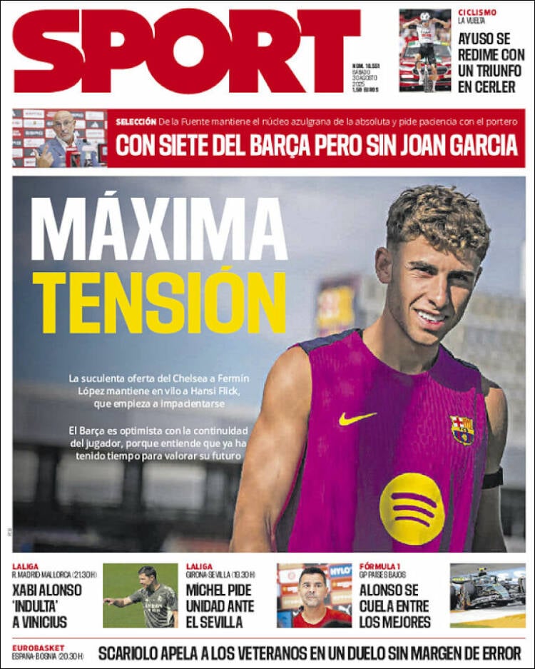 En los medios catalanes, Fermín es el centro de todo. El Chelsea ha perdido a Xavi Simons y tiene la opción del centrocampista español como la favorita para este final del mercado. Hay pequeñas menciones a las victorias de Alcaraz y Ayuso, a la convocatoria de la Selección Española y al Eurobasket con el partido de España ante Bosnia.