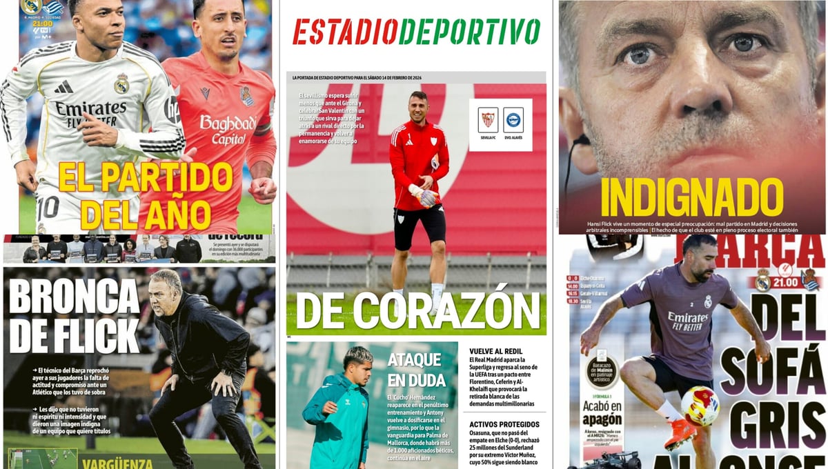 Las portadas de la prensa deportiva de este sábado 14 de febrero llegan cargadas de actualidad y con mucho que contar metidos de nuevo ya en una jornada de Liga, la 24ª, que comenzó anoche con el empate a cero entre Elche y Osasuna. Pero hoy nos esperan más partidos, como el que protagonizarán Sevilla y Alavés en el Ramón Sánchez-Pizjuán, un duelo en el que habrá que poner todo el corazón, donde el sevillismo espera sufrir menos que ante el Girona y celebrar San Valentín con un triunfo que sirva para dejar atrás a un rival directo por la permanencia y volver a enamorarse de su equipo, tal y como destacamos en la portada de ESTADIO Deportivo.