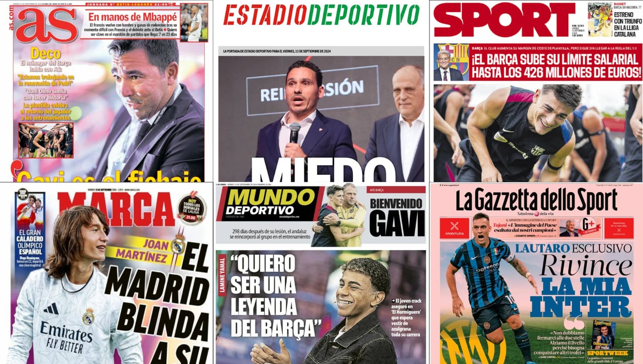 Las portadas de este viernes 13 de septiembre de 2024 viene con temáticas muy variadas según el medio, pero con elementos comunes en todas ellas. Y es que la publicación de los límites salariales de cada equipo en LaLiga ya ha generado los primeros debates entre sus aficionados. Asimismo, las declaraciones del joven Lamine Yamal en 'El Hormiguero' o la reaparición del barcelonista Gavi también ocupan su lugar en casi todas ellas.