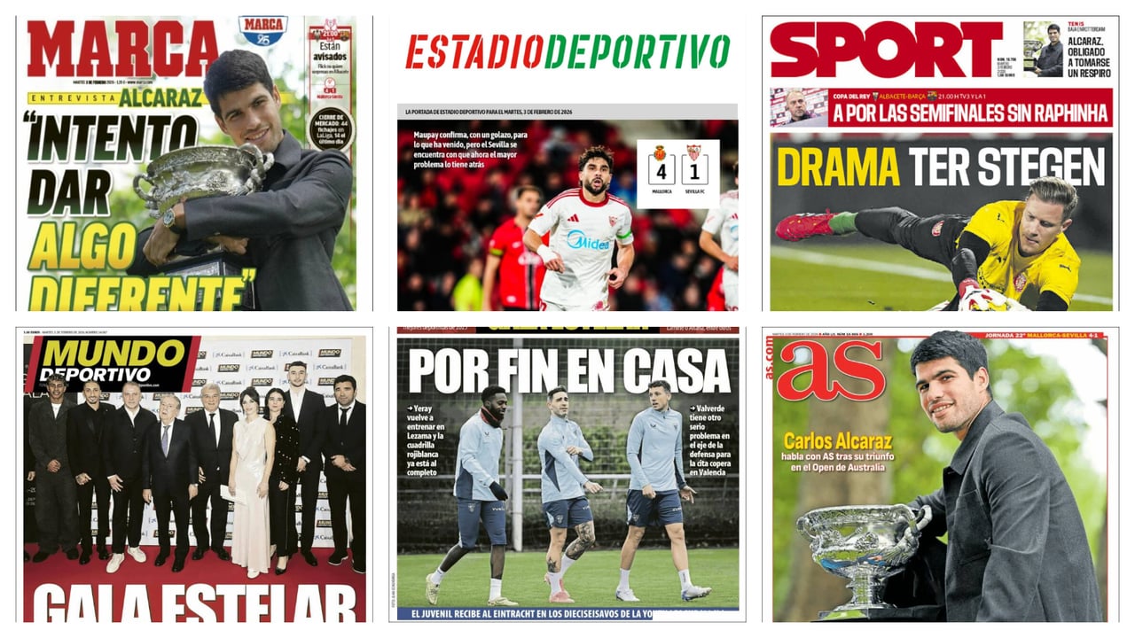 La derrota del Sevilla, Ter Stegen y el hambre de Carlos Alcaraz protagonizan las portadas de la prensa deportiva a 3 de febrero de 2026