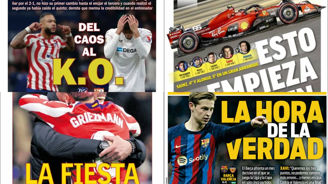 Las portadas de la prensa deportiva de este domingo 5 de marzo llegan con la resaca de la jornada liguera de ayer sábado donde el protagonista fue un Sevilla Fútbol Club que cayó goleado por 6-1 frente al Atlético de Madrid, lo que vuelve a dejarlo al borde del descenso, al que puede caer hoy si ganan Valencia y Valladolid sus respetivos partidos. Pero más allá de la opción de caer al descenso fue de nuevo la imagen ofrecida y que no da motivos para la esperanza. Y eso que se llegó con 2-1 al descanso, pero el desorden y la fragilidad de un equipo despedazado se hizo evidente en la segunda parte, donde Jorge Sampaoli no hizo su primer cambio hasta el encajar el tercero y cuando realizó el segundo ya había caído el quinto, en una derrota que merma la credibilidad en el entrenador. 'Del caos al K.O.', titulamos en la portada de ESTADIO Deportivo.