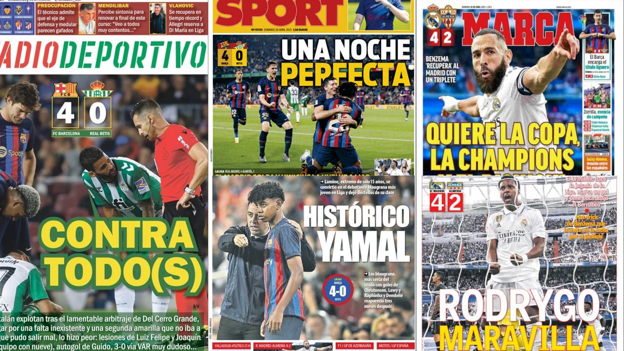 "Contra todo(s)", titulamos hoy en nuestra portada de ESTADIO Deportivo llevando a primera página la indignación del club verdiblanco, personificado anoche en el vicepresidente José Miguel López Catalán y Manuel Pellegrini, que no dudaron a la hora de señalar a Del Cerro Grande y que además vieron como Luiz Felipe y Joaquín tenían que abandonar el campo por lesión. Desde Barcelona las portadas son bien distintas, pues ni Mundo Deportivo ni Sport mencionan nada del arbitraje del colegiado madrileño y destacando el juego del líder de LaLiga. "Una noche perfecta" e "Histórico Yamal" son sus titulares.