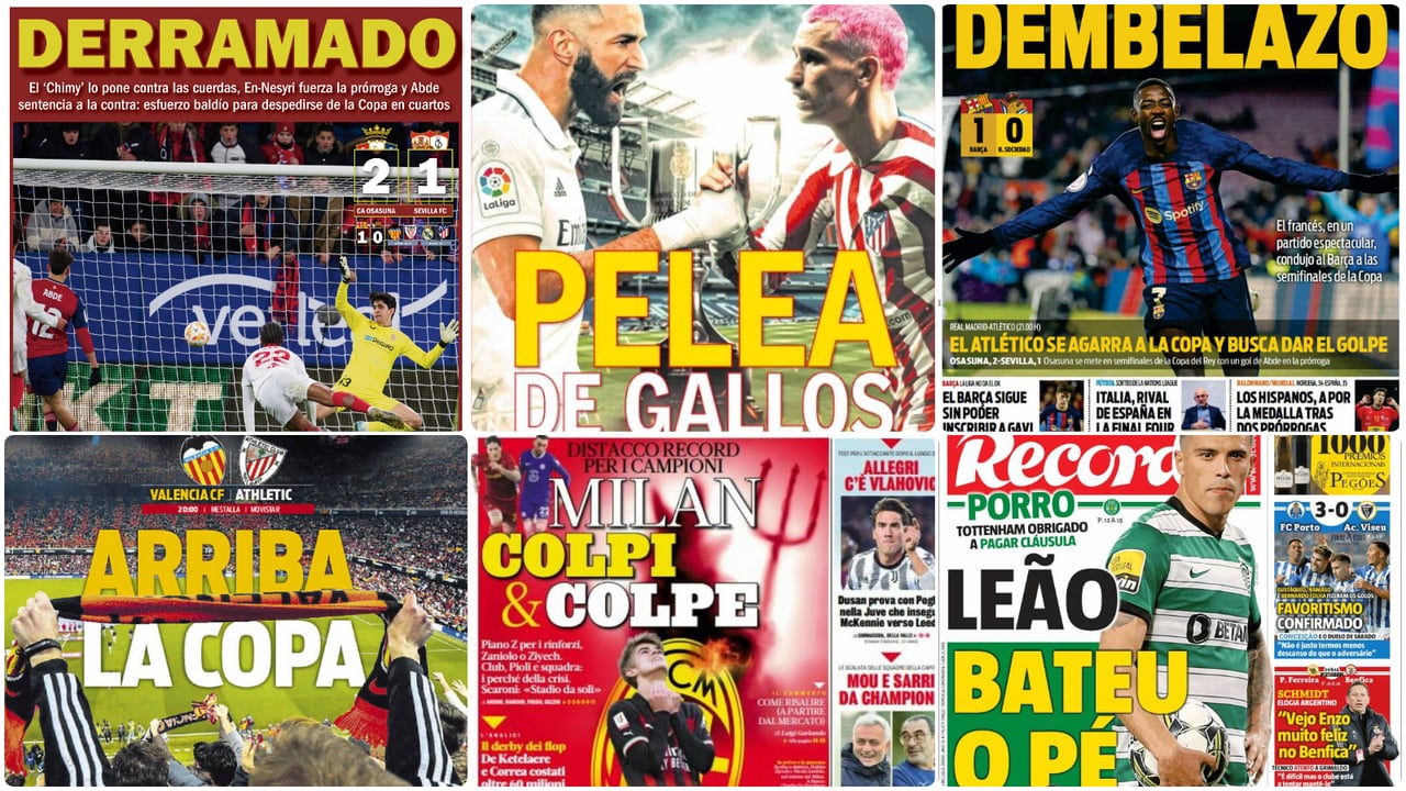 El FC Barcelona selló su pase a semifinales de la Copa del Rey este miércoles al superar (1-0) a la Real Sociedad en el Spotify Camp Nou, un duelo con dominio y ocasiones locales en su mayoría, y con el golazo de Ousmane Dembélé para avanzar sobre un equipo vasco que no tuvo su mejor día y, además, jugó en inferioridad desde el 40'. El equipo de Xavi Hernández alargó su aventura copera, otra opción de título tras ganar la Supercopa de España hace dos semanas.El Real Madrid recibe este jueves (21:00 horas/La 1) al Atlético de Madrid en un partido clave para el actual estado anímico de ambos conjuntos y con el añadido del deseo de apear de la competición a su vecino y rival. El Santiago Bernabéu no acoge un partido de Copa desde la eliminación en 2020 ante la Real Sociedad y aún no ha visto a su equipo tras el parón por el Mundial. Ahora, el feudo blanco acogerá un derbi copero que no se veía desde la temporada 2014/2015, con pase a cuartos rojiblanco y segundo derbi esta campaña tras la victoria madridista (1-2) en el Metropolitano en septiembre.Valencia CF y Athletic Club se enfrentan también hoy (20:00 horas) en Mestalla en un duelo al que los 'leones' llegan algo alicaídos y con la irregularidad como protagonista, aunque con ganas de venganza tras la eliminación del curso pasado a manos de un conjunto ché, que ve en las semifinales del torneo el aliciente para revertir una primera vuelta más que discreta.En cuanto al mercado de fichajes, muchos movimientos en el Real Betis, con Loren Morón a punto de marcharse al CD Tenerife, según admitió su padre; con remotas posibilidades de vender a Willian José y con rumores de posibles ofertas de última hora por Borja Iglesias, Luiz Henrique, Luiz Felipe, Guido Rodríguez... No obstante, la noticia del día en el mercado es la que apunta a que Ayoze Pérez comienza a explorar otras vías -con el Villarreal en la 'pole'- ante el temor de que el cuadro verdiblanco no logre cerrar salidas para hacerle sitio.
