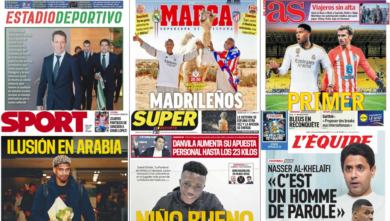 La Supercopa es la dueña y señora de las portadas en la prensa española en este miércoles 10 de enero del 2024, con especial atención a Real Madrid y Atlético de Madrid, por ser quienes la inauguran. A partir de las 20.00 horas arrancará la primera semifinal en la edición del campeonato y mañana 11 de enero será el turno de FC Barcelona y Osasuna. En la prensa internacional, una de las cuestiones a destacar no es otra que Mbappé y las palabras alrededor de su futuro que ha hecho el presidente del PSG Nasser Al-Khelaïfi a RMC Sport. Hay otros temas, como el joven Otorbi del Valencia, que hizo historia al debutar el pasado domingo 7 de enero ante el Cartagena, la baja de Chimy Ávila en Osasuna o la decisión de Xavi de llevarse a varios jugadores que aún no tienen el alta médica a Rida, Arabia.